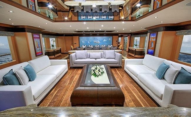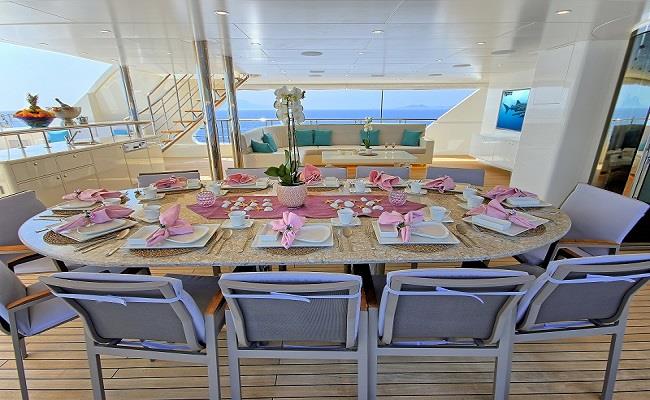 Her outdoor areas are perfectly equipped for relaxation and entertainment while at sea, in particular the large saloon on main deck, which affords also exterior dining place and sofas. There are four sunbathing areas, one large Jacuzzi on fly bridge deck and very large comfortable sky lounge with large main sunbathing area, bar, sofas, dining place and barbeque area.